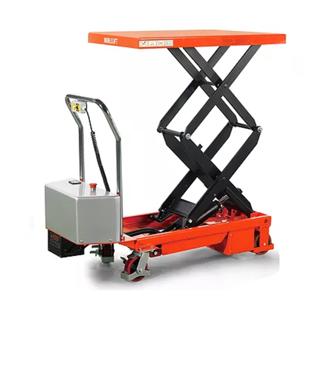 Платформенная тележка с электроподъемом грузоподъемностью 350кг, и двойным ножничным подъемным механизмом.