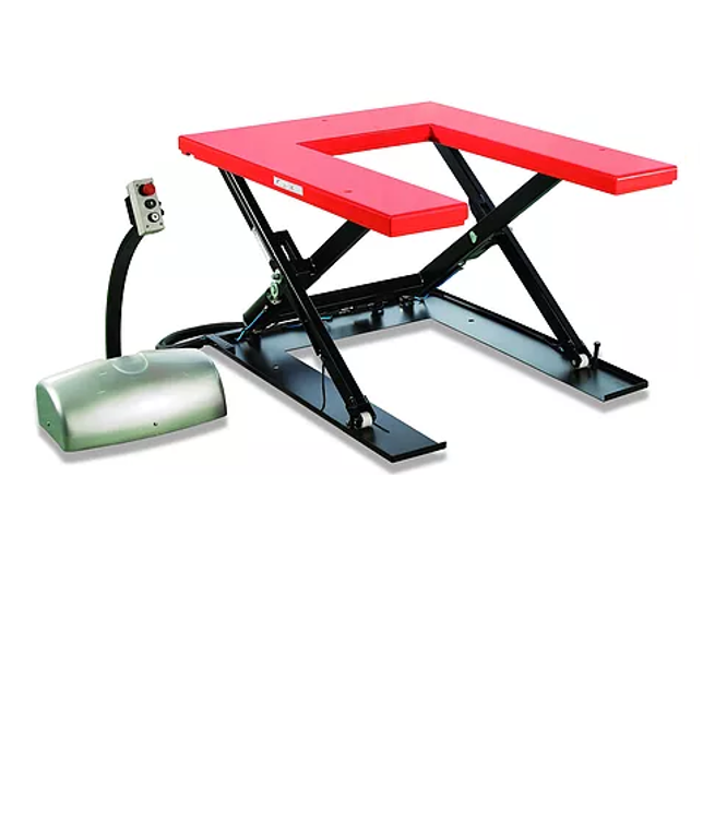 Подъемный стол с ножничным механизмом подъема грузоподъемностью 1000кг и выносной гидравлической станцией, а также с U-образным вырезом для въезда стандартной гидравлической тележки.